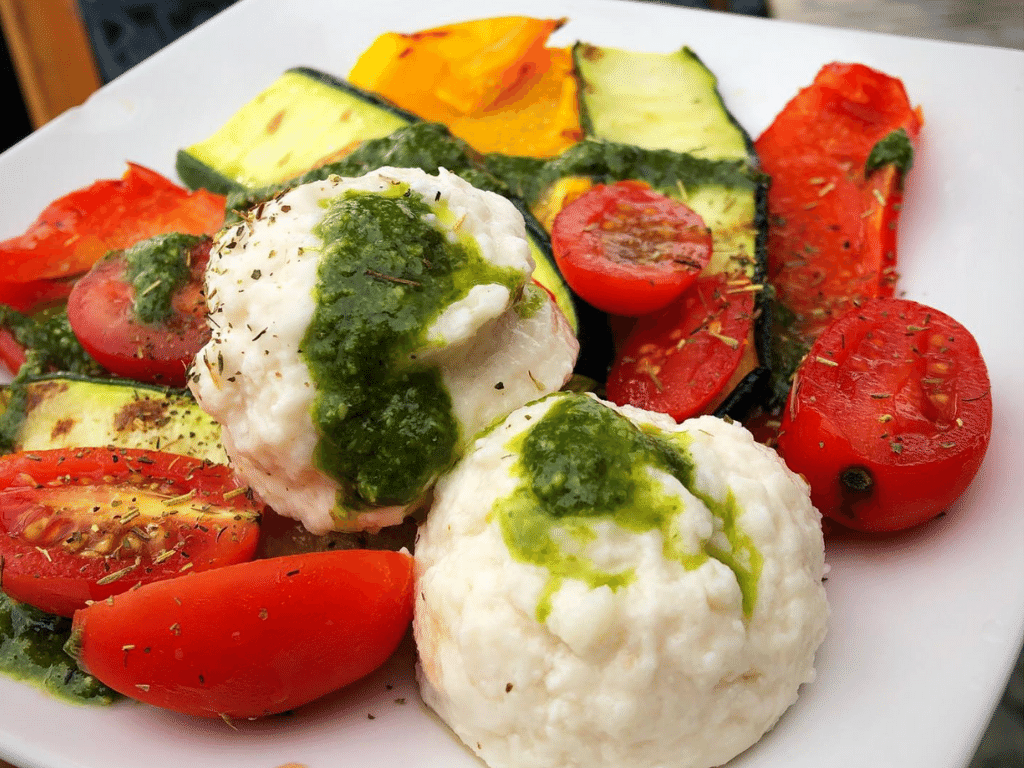 Queso fresco vegetariano, pasta rellena artesanalmente, tarta de queso de arándanos, tortilla española hecha con harina de garbanzos que sabe igual que la original.